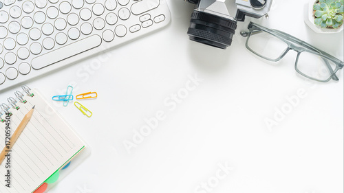 © dera, Fototapeta premium Clean white office desk flatlay with modern keyboard, vintage camera, eyeglasses and succulent for creative workspace and productivity vibes