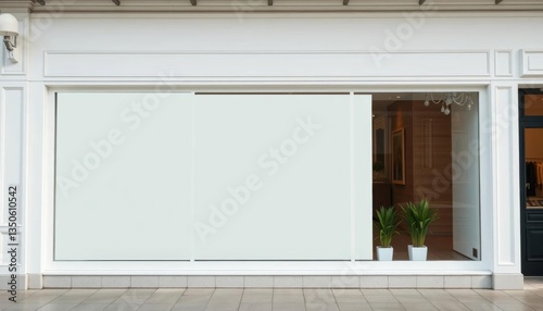Fototapeta premium Clean white storefront mockup; blank glass windows, modern design,...