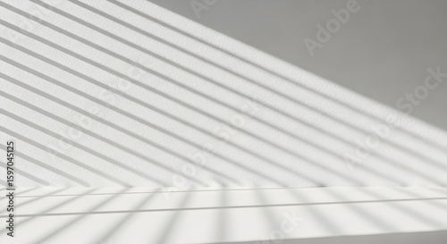 Obraz premium Clean white studio background with diagonal shadow lines from blinds,...