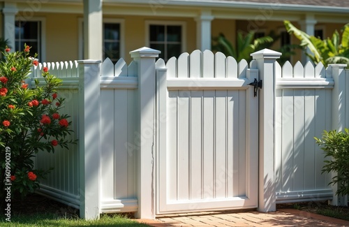 © Viktor, Naklejka premium Clean white vinyl fence with gate borders tranquil residential yard in sunny Florida. Rich green vegetation, vibrant red flowers frame scene. Fence offers privacy, security, creating peaceful outdoor