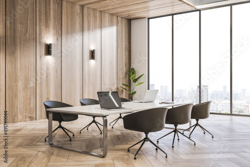 © Who is Danny, Fototapeta premium Clean wooden conference room interior with furniture and window with window and city view. Design and workplace concept. 3D Rendering.
