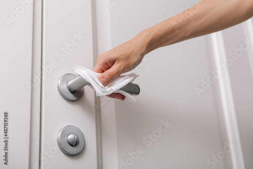Obraz premium Cleaning door handles with an antiseptic wet wipe and gloves. Sanitize surfaces prevention in hospital and public spaces against corona virus. Woman hand using towel for cleaning home room door link