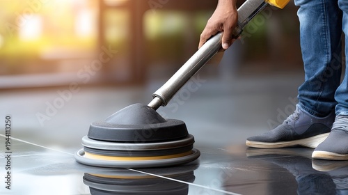 Fototapeta premium Cleaning floor with machine in office setting to maintain hygiene and cleanliness during daytime hours for a commercial environment