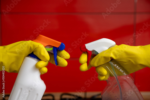 © fotodrobik, Obraz premium Cleaning Supplies in Action Spray Bottles for Achieving a Sparkling Clean and Hygiene