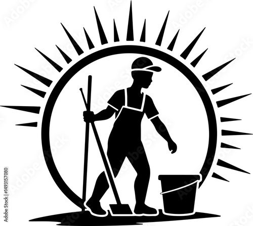 Obraz premium Cleaning Worker Emblem with Sunburst Design