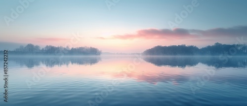 Fototapeta premium Clear background of a calm lake at dawn, with mist rising and soft pastel...