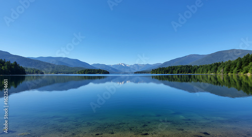 Naklejka premium Clear blue alpine lake with snow-capped mountains and mirror-like reflection,...