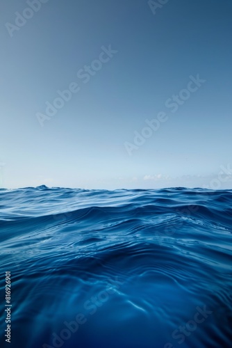 Fototapeta premium Clear blue ocean under a bright sky - Pristine view of the clear blue ocean gently undulating under a bright and sunny sky, evoking a sense of calm and clarity