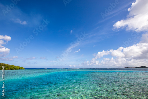 © Narkyy Image, Fototapeta premium Clear Blue Ocean Water Touching Rugged Rocky Shore under Bright Sky