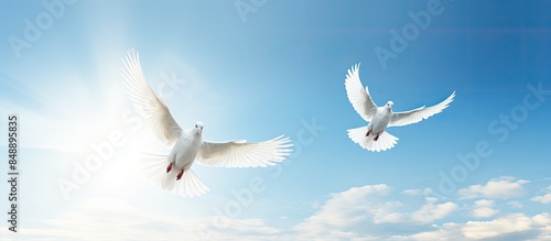 Obraz premium Clear blue sky with two doves in flight perfect for a copy space image