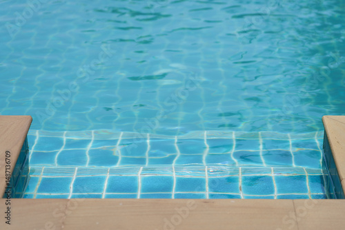 Obraz premium Clear Blue Swimming Pool with Steps and Sunlight Reflections. Related to vacation, leisure, or wellness. Relaxing summer vibe.