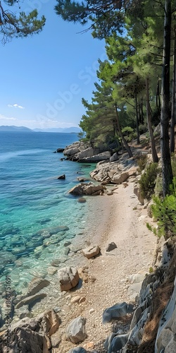 © Adobe Contributor, Fototapeta premium Clear Blue Water and Rocky Beach in a Tranquil Forest Setting