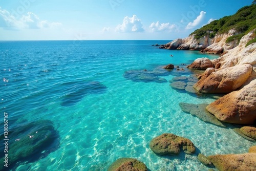 Fototapeta premium Clear blue water laps smooth rocks, idyllic seascape , calm, cliff, rocks