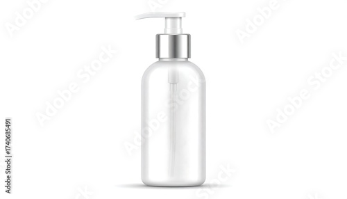 Fototapeta premium Clear, cylindrical bottle with a silver pump dispenser, isolated on white