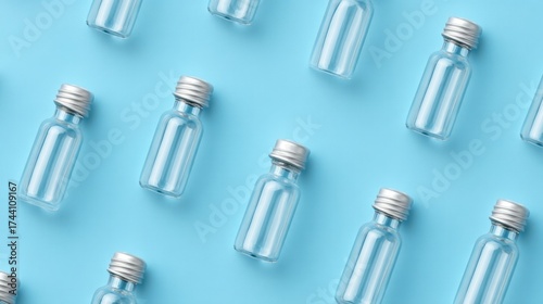 © 69, Naklejka premium Clear Glass Bottles with Metal Caps Arranged on a Blue Background Ideal for Packaging, Storage, and Creative Projects in Various Industries