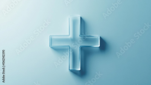 Obraz premium Clear glass cross symbol on a soft blue background during daylight