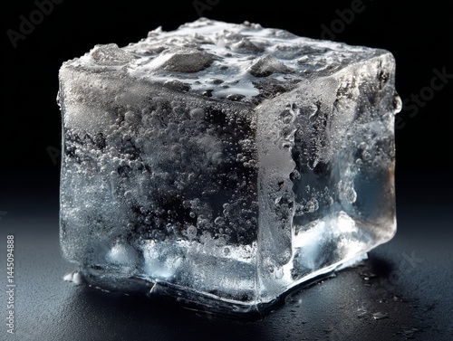Obraz premium Clear ice cube with bubbles reflecting light against a dark background...