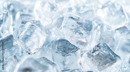 © Chingiz, Obraz premium Clear ice cubes forming a textured background, top-down perspective