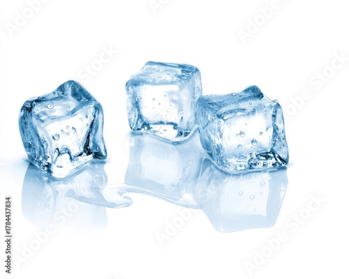 © kanesuan, Fototapeta premium Clear Ice Cubes on Reflective Surface with Melting Water Droplets