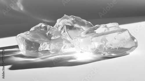 Obraz premium Clear ice cubes on white surface, illuminated by sunlight, casting shadows.