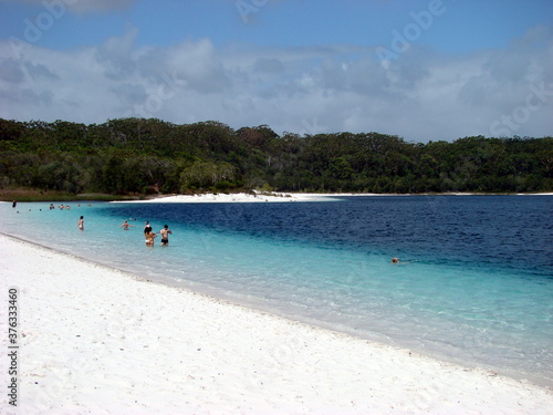 © Mark, Naklejka premium clear lake blue white sand trees beach