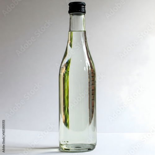 Fototapeta premium Clear liquid bottle with black cap against white backdrop.