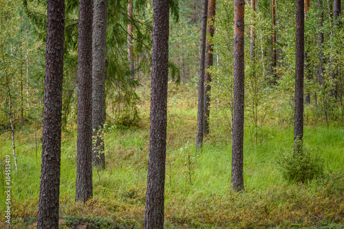 © Martins Vanags, Obraz premium clear morning in the woods. spruce and pine tree forest with trunks in summer
