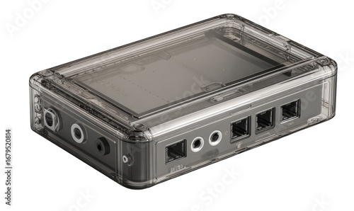 © Adri, Obraz premium Clear plastic case encloses a gray electronic device. Ports visible