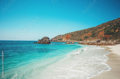 © AIArtistry, Fototapeta premium Clear sky over ocean and rocky shore, water, beach, summer, travel, nature, tree, scenery, sunlight