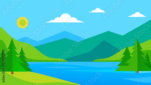 © Profullya, Obraz premium Clear Summer Day at a Lake Background Scene for Peaceful Digital Art