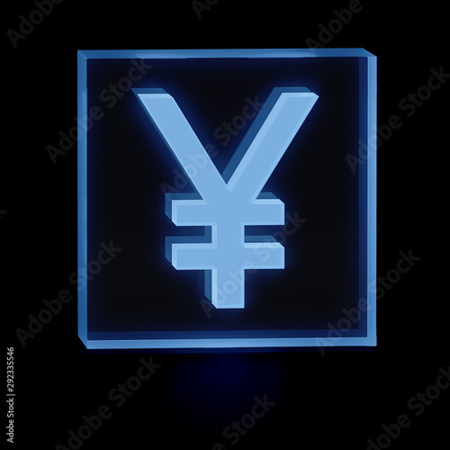 Obraz premium Clear transparent glass or plexiglass display with luminous money yuan or yen shape inside on dark background, 3D rendered image