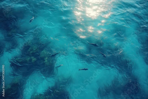 © Jdgkxbnc, Fototapeta premium Clear turquoise ocean water with fish swimming near underwater rocks reflecting sunlight