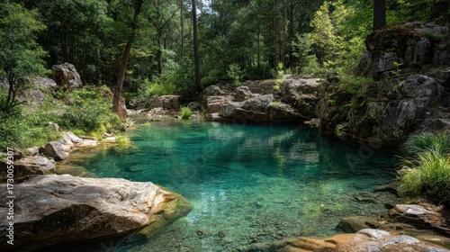 © cha, Naklejka premium Clear turquoise pond nestled amidst rocks and lush greenery within a verdant forest