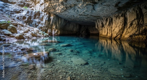 Fototapeta premium Clear, turquoise water in a rocky cave, reflections on surface