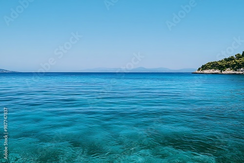 © atar, Fototapeta premium Clear turquoise water of a calm sea on a sunny day with a small island in the distance