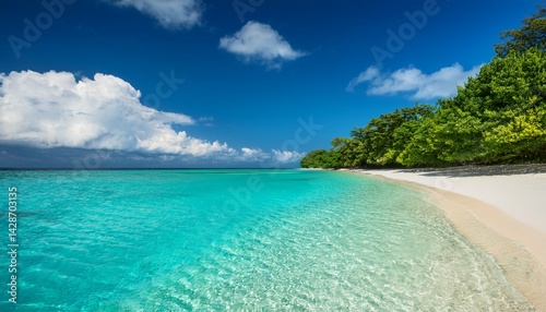 © Beste stock, Naklejka premium clear turquoise waters gently lap against a sandy shore surrounded by vibrant green trees brilliant blue skies and scattered clouds create a peaceful atmosphere