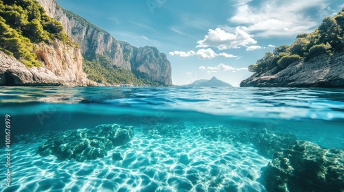© SETSU ST, Fototapeta premium Clear waters under Europe, peaceful and pristine, no fish in view, with copy space for writing.