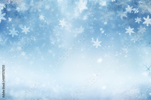 Fototapeta premium Clear white snowflakes on a blue background winter atmosphere outdoors.