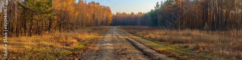 © The 2R Artificiality, Fototapeta premium Clearing with a forest road under a clear blue sky