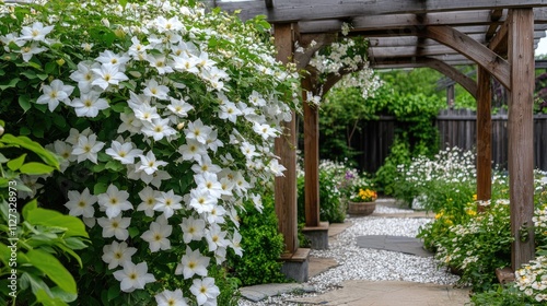 Naklejka premium Clematis flowers blooming in a tranquil backyard garden with wooden pergola and stone pathway creating a romantic outdoor retreat