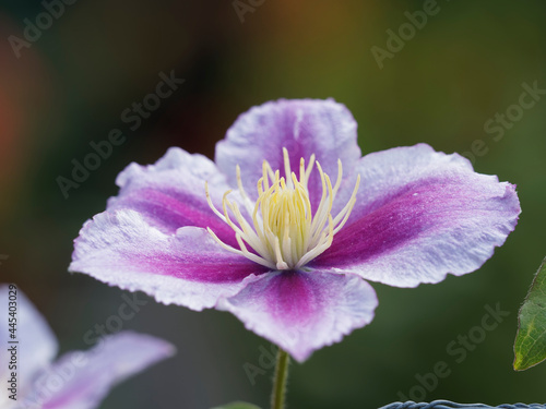 Naklejka premium Clematis 'Piilu' | Clématite liane 'piilu' ou 'Mini Dr. Ruppel' à petites fleurs à sépales blanc, rose clair à mauve, bandes centrale foncées, anthères jaune crème dans un feuillage simples et opposée
