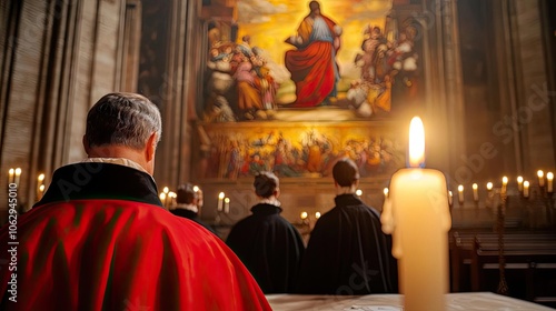 © PBMasterDesign, Naklejka premium Clerics in procession during a religious service with candlelight ambiance.