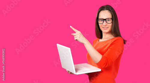 © A Stock Studio, Naklejka premium Clever brunnette woman programmer or sociale media manager holding in hands laptop isolated pink color background. Online education. Showing a finger up. Online shopping.