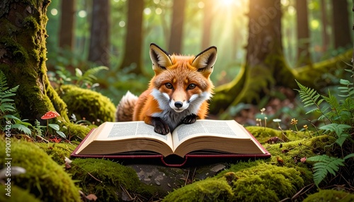 © ruangrit19, Fototapeta premium Clever Fox Reading a Book in Enchanted Forest Education Concept Storytelling Wildlife Nature Learning Magic.