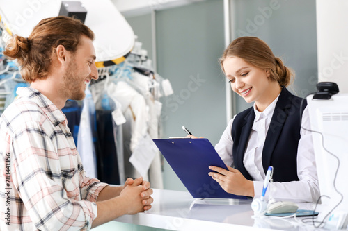 Obraz premium Client near reception desk of modern dry-cleaner's