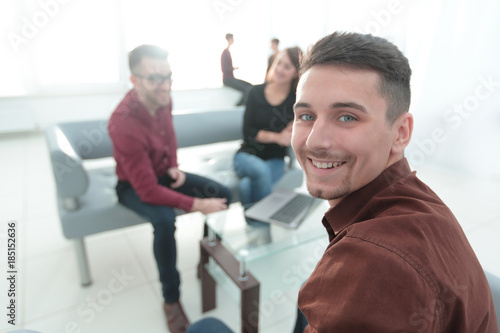 © ASDF, Fototapeta premium client on the background of the Bank's employees