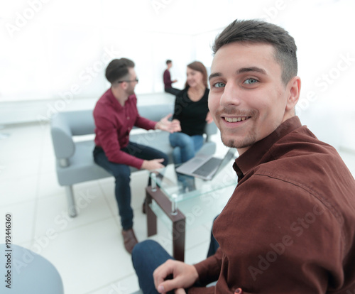 © ASDF, Obraz premium client on the background of the Bank's employees