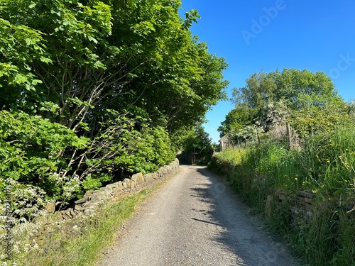 Naklejka premium Cliffe lane, with dry stone walls, farm building, wild plants, and trees, set against a blue sky in, Thornton, Bradford, UK