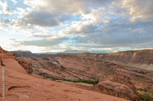 © ssmalomuzh, Fototapeta premium cliffs of Salt Valley at sunrise panoramic view from Delicate Arch Arches National Park, Moab, Utah