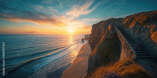 © AkuAku, Obraz premium Cliffs with stairs in Landudno, England, UK, highlighting erosion risk and shoreline preservation